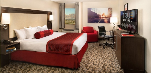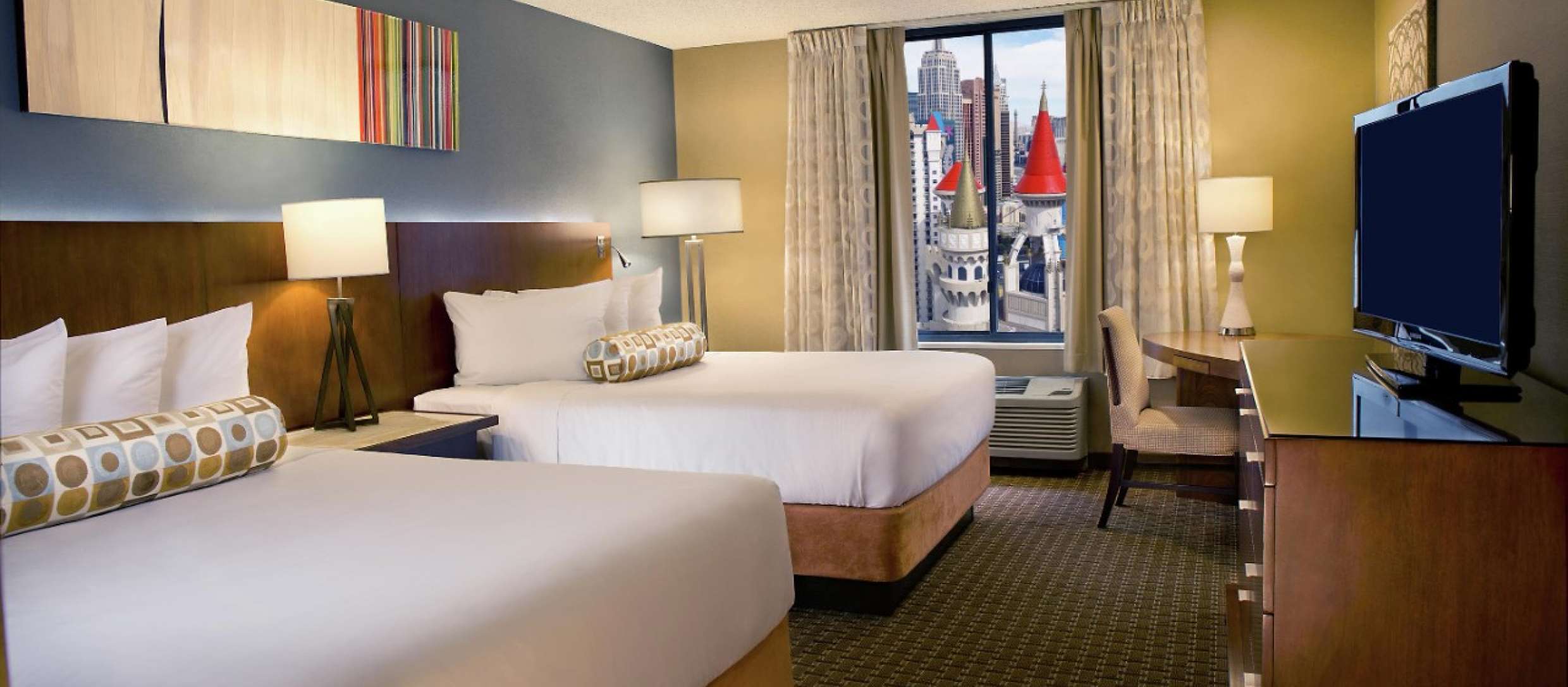 Este hotel casino, inspirado en la leyenda de Camelot y conectado a los resorts colindantes New York‑New York y Tropicana mediante pasarelas elevadas, se encuentra en el extremo sur de la Strip, frente al Aeropuerto Internacional McCarran. Las habitaciones son acogedoras y tienen televisión de pantalla plana y Wi‑Fi. Las suites incluyen sala de estar, comedor y mininevera. Hay servicio de habitaciones
